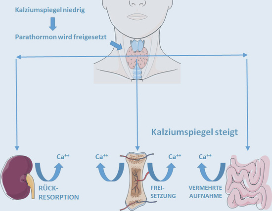 Der Parathormonspiegel im Blut hängt also stark vom Kalziumgehalt des Blutes ab. Dieser wiederum ist auch abhängig von anderen wichtigen Faktoren, zum Beispiel vom Vitamin D (Calcitriol), das ebenfalls den Kalziumgehalt des Blutes anhebt. Bei einem Vitamin-D-Mangel kommt es also zu einer erniedrigten Kalziumkonzentration im Blut, was wiederum die Nebenschilddrüsen zur Produktion von Parathormon anregt.